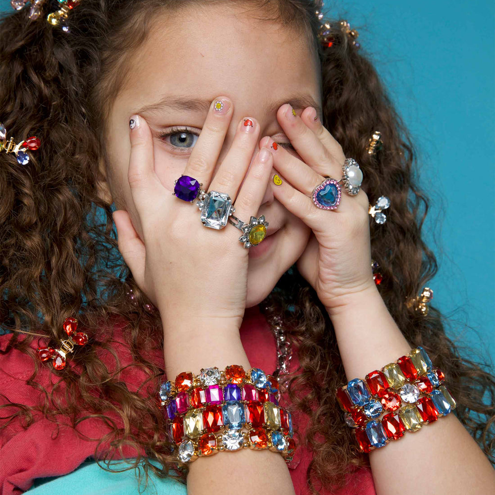 Raise a glass (of apple juice!). It’s five-o’clock somewhere, meaning it’s time to kick up the sparkle. These bracelets are stretchy and stackable—perfect for snack-time, dress-up-time, or anytime in between. Oversized and vibrant gemstones make the ultimate statement. One of our original sets, these jewels are in high-demand year-round and sell out fast!