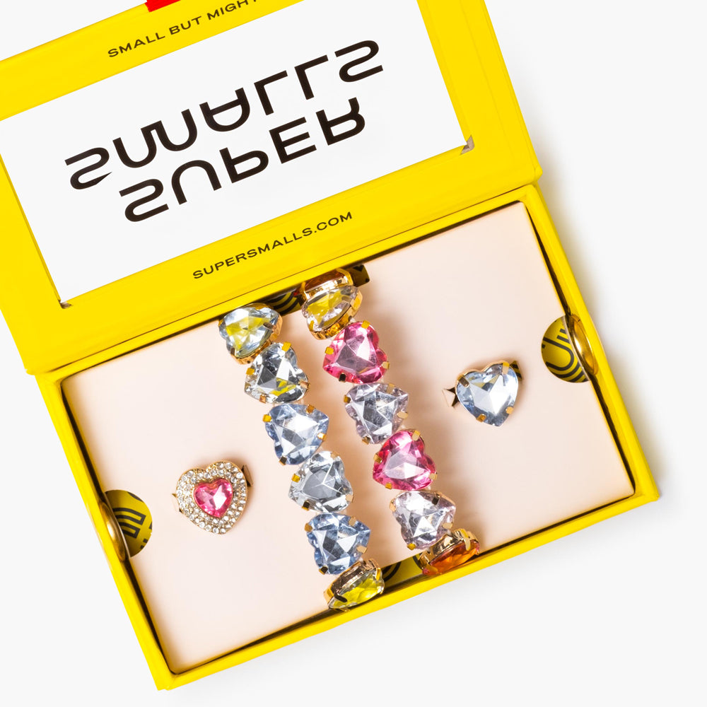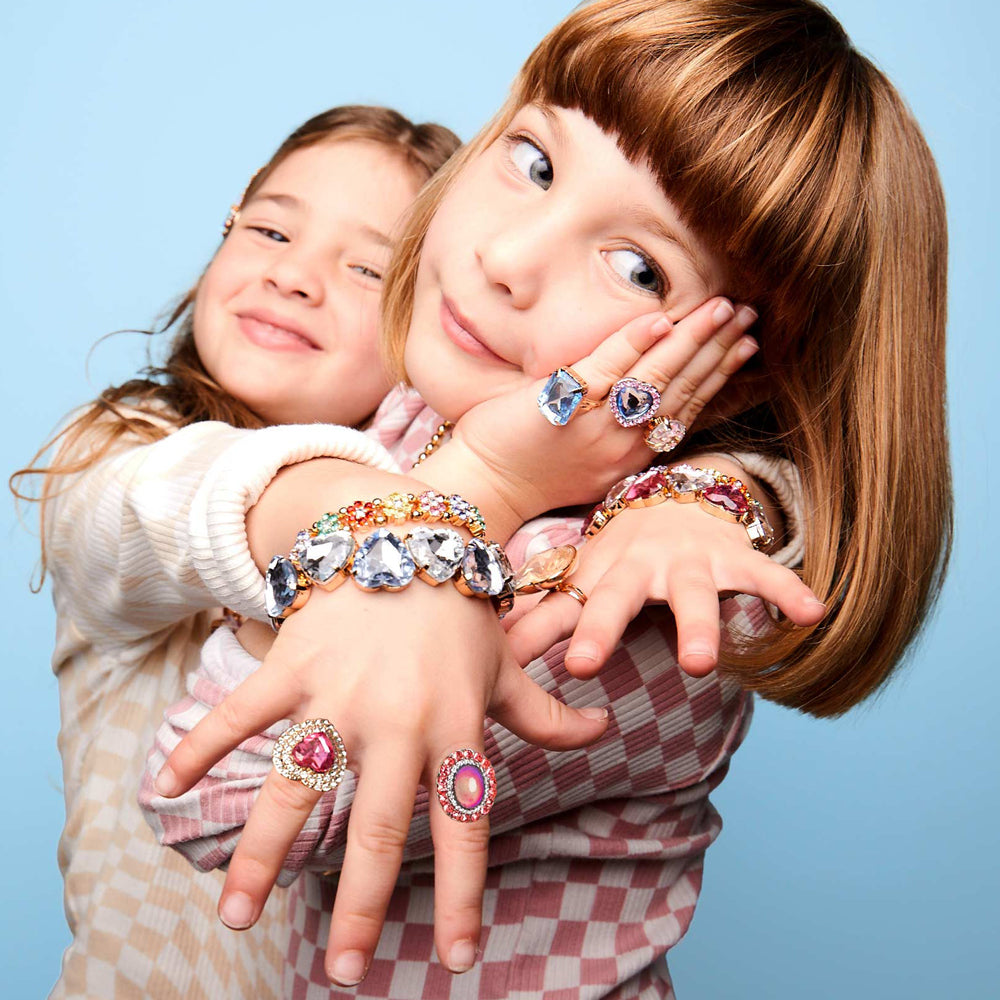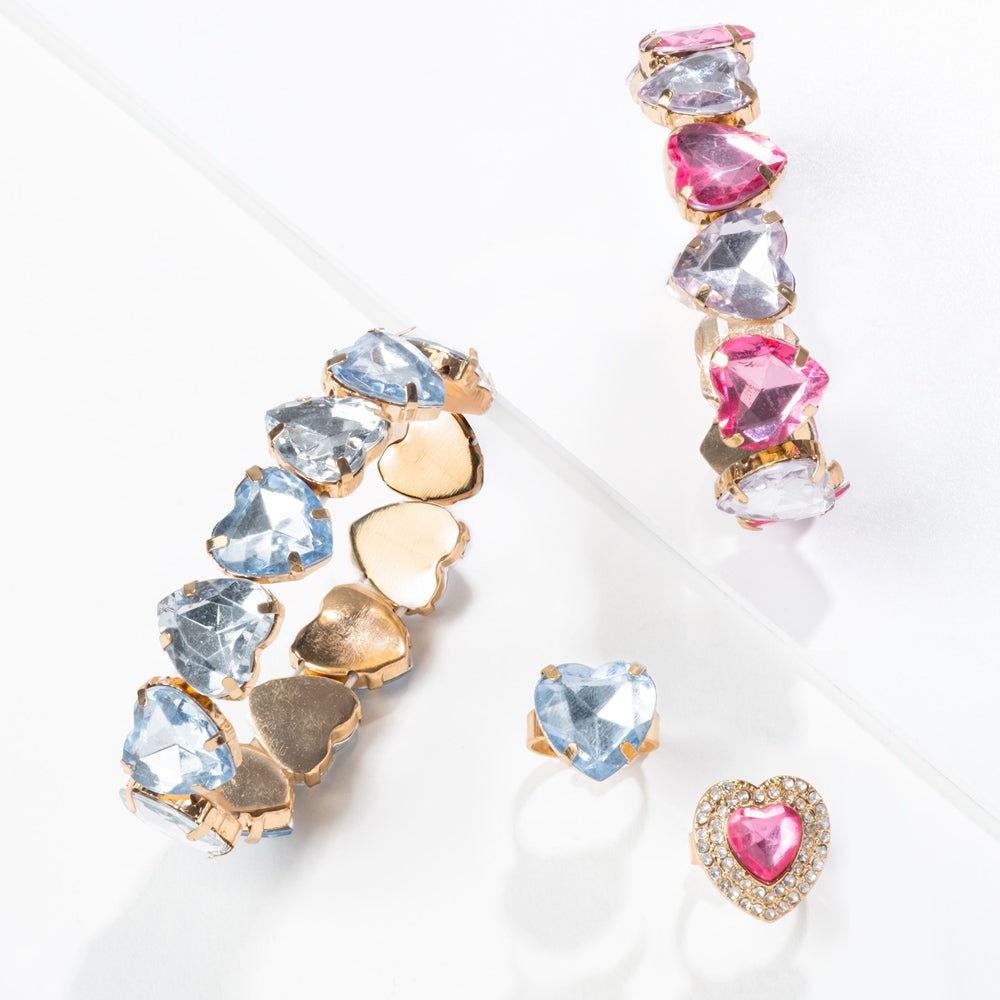 Wear your heart on your sleeve… or rather, your wrist and fingers! This set is all about showing off your big love with big, heart-shaped gems. The set comes with two bracelets and two rings—one set is pink and the other is blue. Perfect for sharing with a super friend or stacking them all for a doubly delicious look. We think you’ve got a heart of sparkles!
