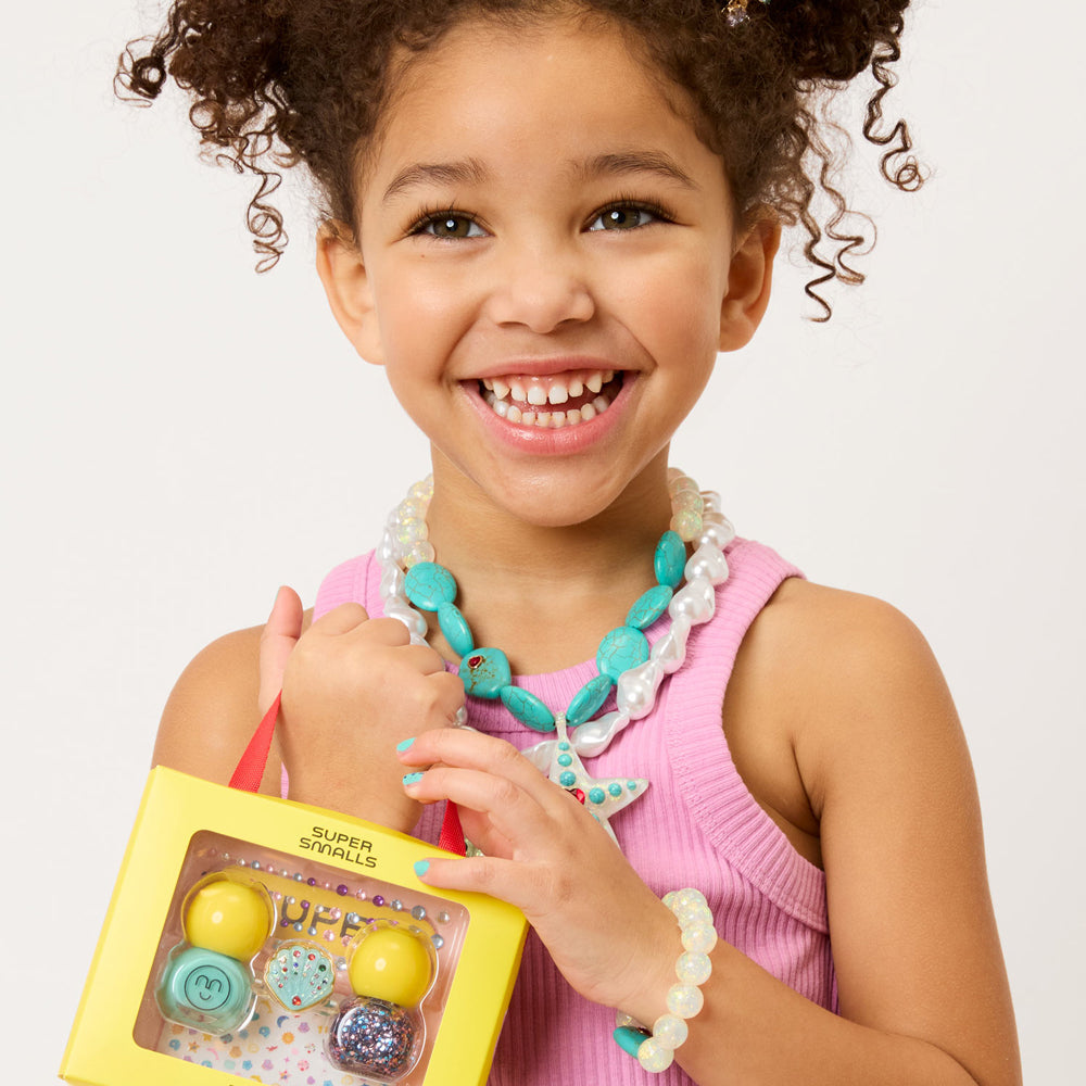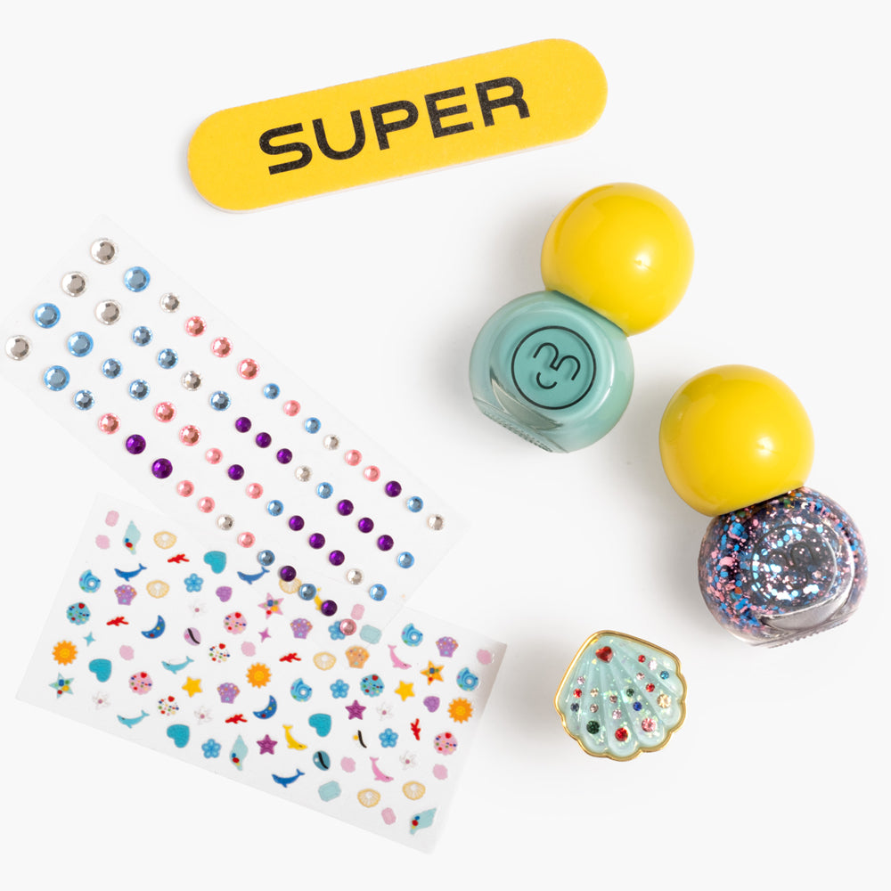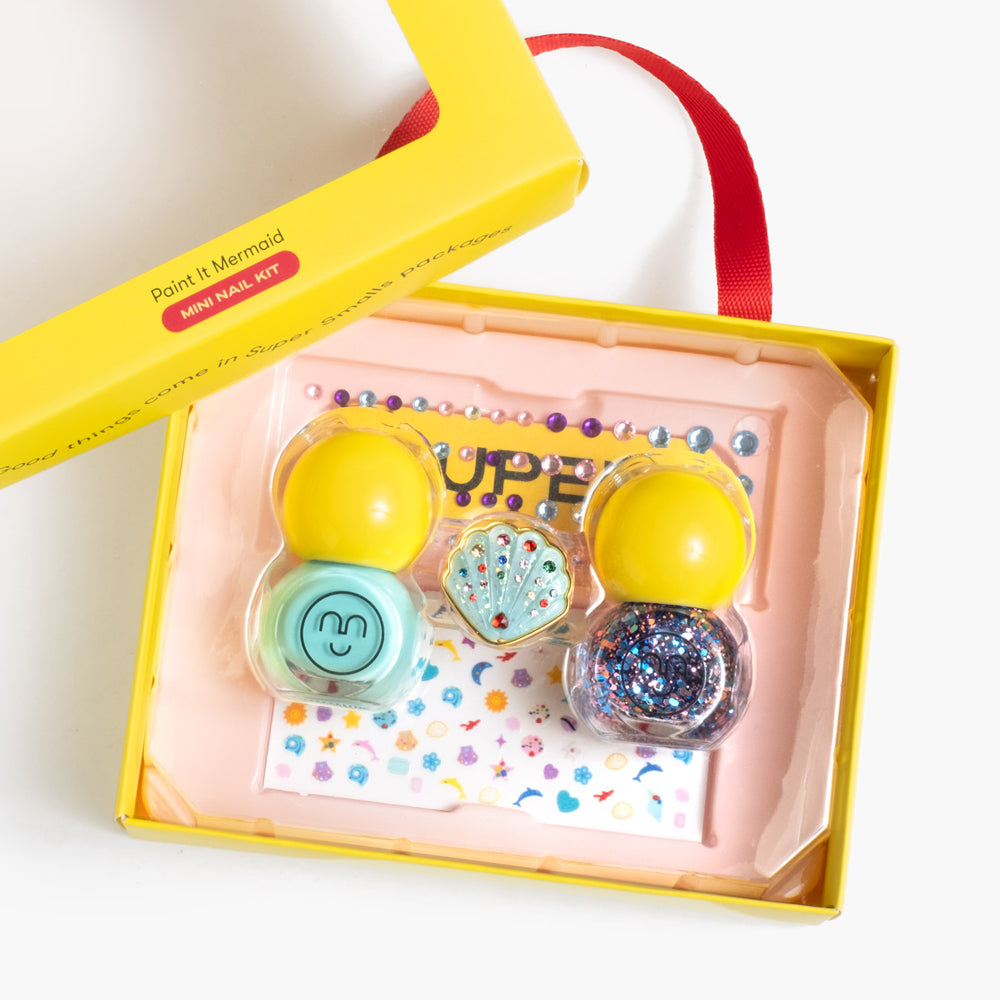 Dive nails-first into the fun with our Paint It Mermaid Mini Nail Kit! This ocean-inspired manicure set includes two peel-off polishes—shimmering sea blue and glittery ocean confetti—plus 135+ shell-themed nail stickers, sparkling gem decals, a gentle nail file, and a sparkly sea shell-shaped adjustable ring. Packaged in a cute, portable box with a handle, it’s everything you need for a sea-worthy mani, wherever you go!