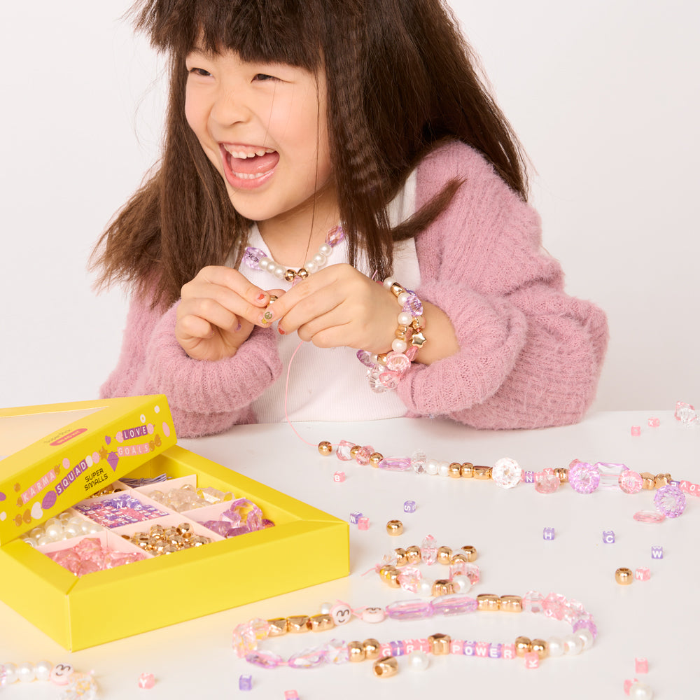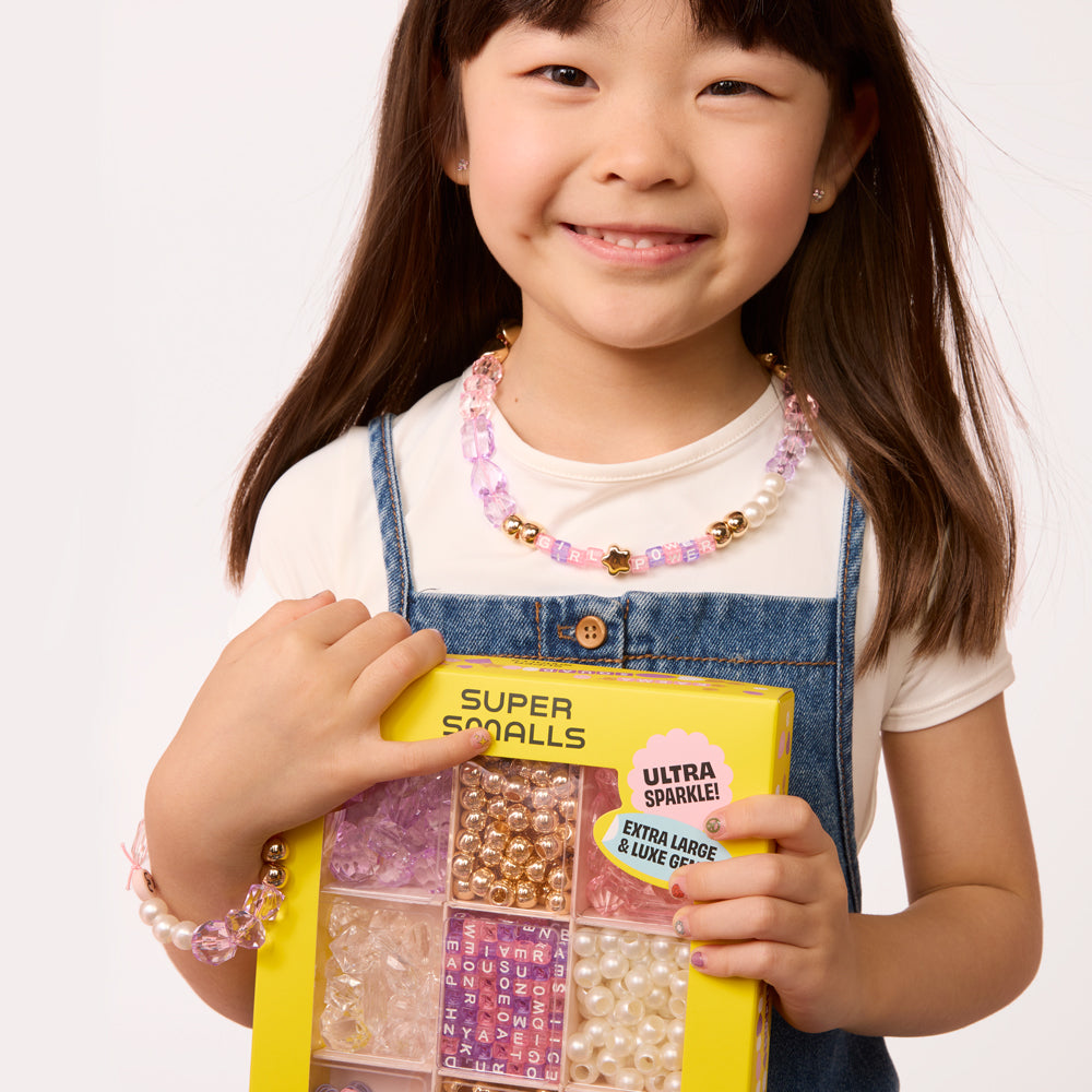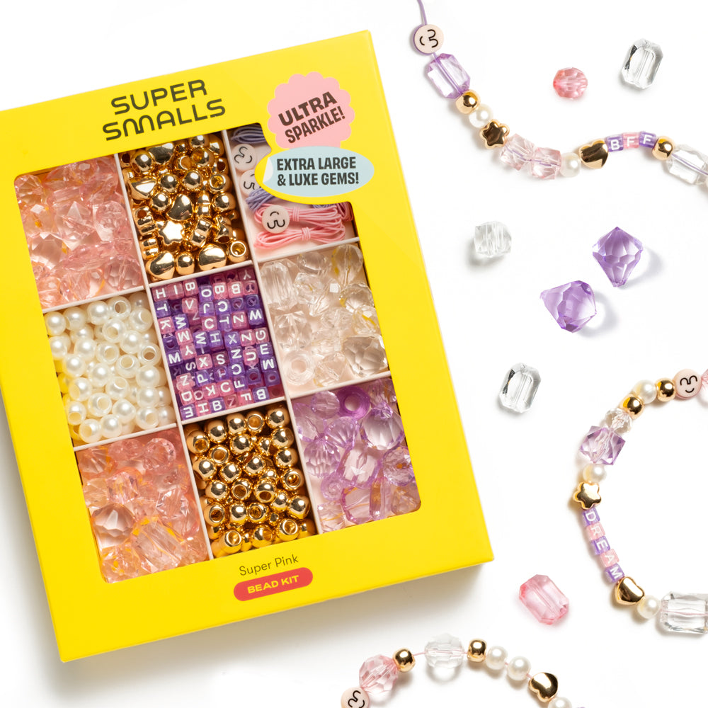 Ready to add some sparkle to your day? The Super Gems Pink Bead Kit is here to help you shine! Packed with vibrant pink and purple beads, playful alphabet beads, and glittering gold -toned and faux-pearl accents, this kit is perfect for creating your very own custom jewelry and accessories. With stretchy string that makes designing a breeze, you can craft necklaces and bracelets that are as unique as you are. Whether you’re spelling out your name or creating a one-of-a-kind design, the Super Smalls kit brings endless fun and creativity to your jewelry-making adventures.