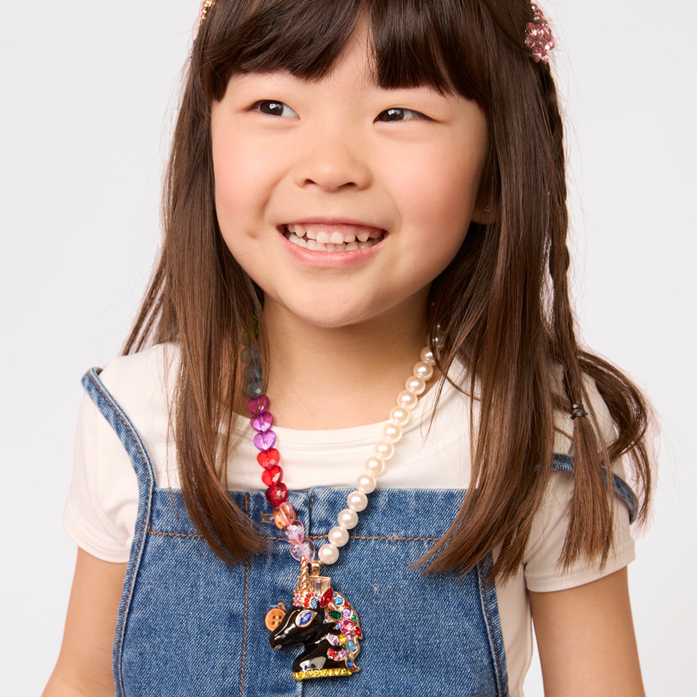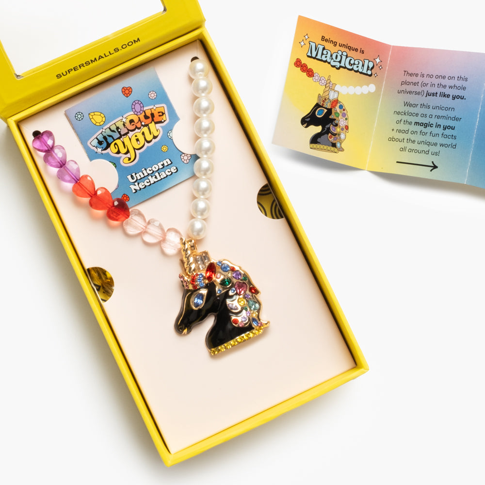 Unicorns are magical beings—just like you! Meet the new & improved Unique You Unicorn Pendant Necklace. This enchanted necklace is the perfect gift for any unicorn enthusiast. Featuring an enamel unicorn pendant with gem accents, and an upgraded stretchy necklace with rainbow and faux-pearl beads.